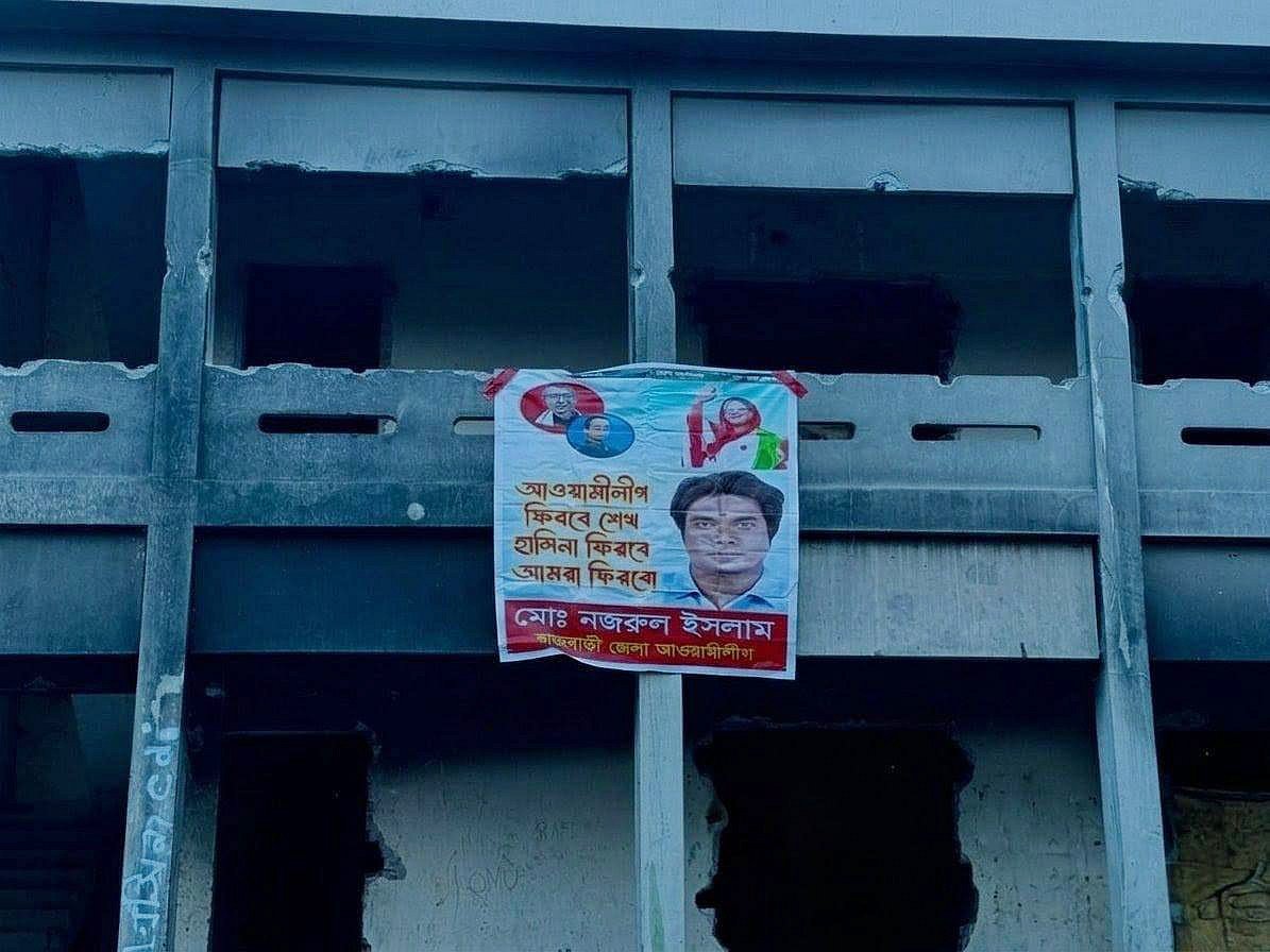 ব্যানারটিতে লেখা আছে, ‘আওয়ামী লীগ ফিরবে, শেখ হাসিনা ফিরবে, আমরা ফিরব।’ এর এক পাশে বঙ্গবন্ধু শেখ মুজিবুর রহমান ও অন্য পাশে ক্ষমতাচ্যুত সাবেক প্রধানমন্ত্রী শেখ হাসিনার ছবি আছে। এ ছাড়া ছাত্রলীগের সাবেক নেতা নজরুল ইসলামের বড় ছবি আছে।